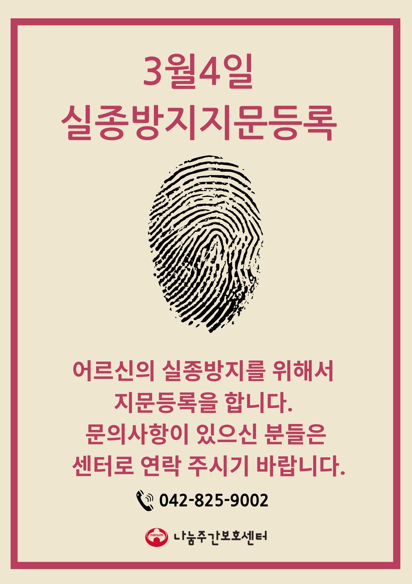 ![]() 3월 4일 어르신 실종방지를 위해서 지문등록을 진행합니다^^ 궁금하신 부분은 센터로 연락주시길 바랍니다. 042-825-9002 |
