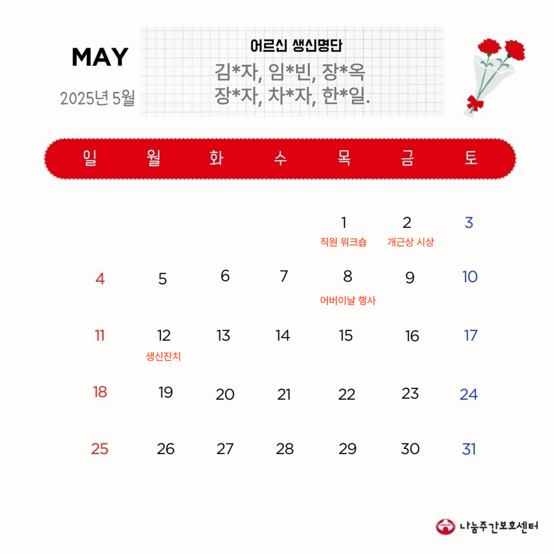 ![]() 안녕하세요 사랑과 정성으로 섬기는 나눔주간보호센터입니다. 2025년 5월 센터 일정을 알려드리겠습니다. 5월1일 직원워크숍 5월2일 개근상 시상 5월8일 어버이날 행사 5월12일 어르신 생신잔치 이렇게 준비되어있습니다. 보호자님께서는 어르신 등원에 착오 없길 바라며 꼭 센터 행사에 참여할 수 있도록 부탁드립니다. 자세한 문의 사항은 센터 채널이나 센터로 전화주시면 감사하겠습니다. ☏ 042-825-9002 |