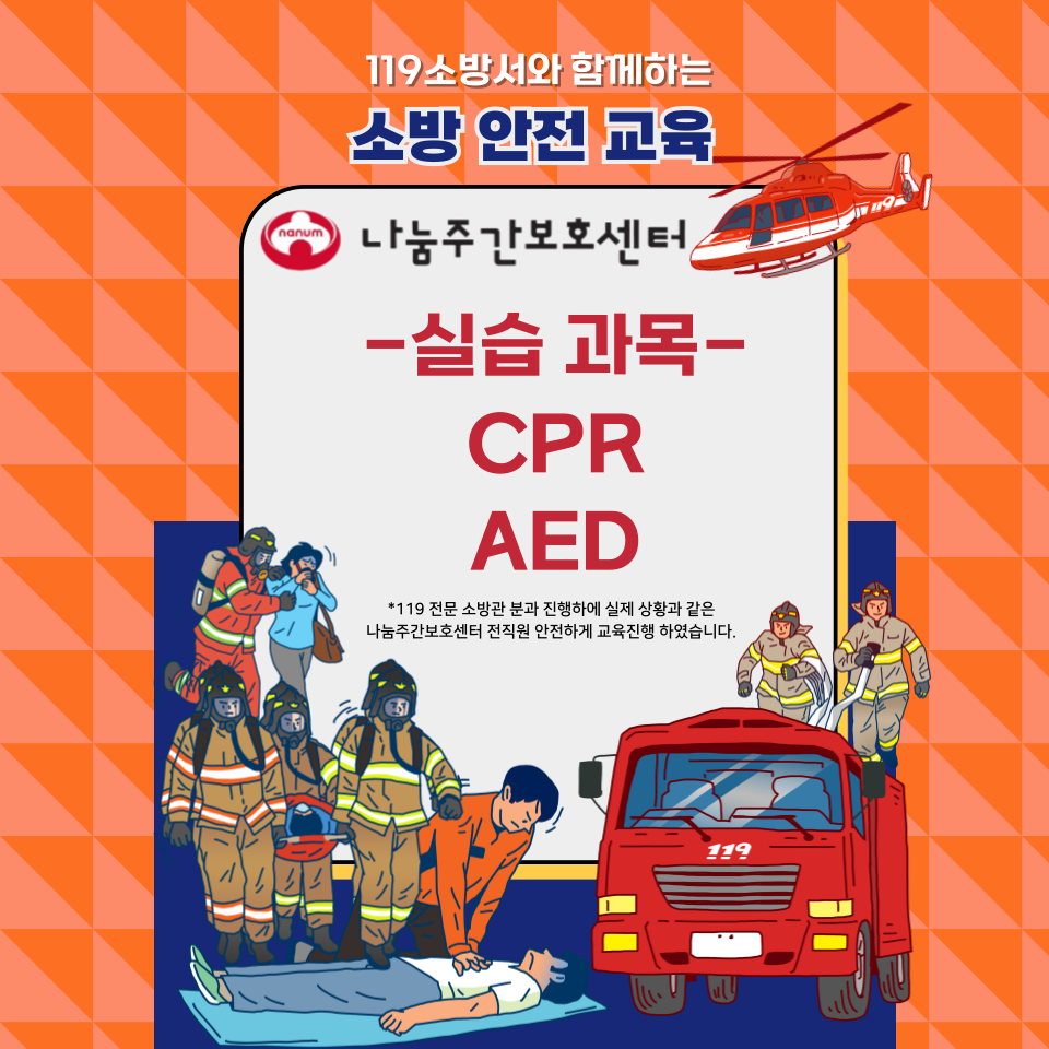 ![]() 안녕하세요~ 사랑과 정성으로 섬기는 나눔주간보호센터입니다. 6월 5일 목요일 13시 30분부터 저희 나눔센터에서는 119 소방서와 함께 소방 안전교육을 받았습니다. https://youtu.be/C8U8fkRWUH0 (소방안전교육 현장 영상) 어르신들과 함께 생활하면서 일어나지 않을 상황에 대해서 좀더 경각심을 갖게 되고 아무리 건강하고 겉으론 지병이 없어 보이더라도 긴급한 상황은 언제 일어날지 그 누구도 예측하기가 어렵습니다. 나 하나 괜찮다고, 나에겐 일어나지 않는 일이라고 방심하다간 사고는 멀리서 일어나는 게 아니라 아주 가까운 곳에서 일어나기 쉬우니 내 가정, 주변 사람들이 다칠 수 있다는 생각을 갖고 미리미리 안전사고에 대비하여 길을 가다가 주변에 곤경을 처한 사람에게 도움을 줄 수 있는 용감한 시민이 되기를 바라는 마음으로 나눔주간보호센터도 안전사고에 놓치지 않겠습니다 |