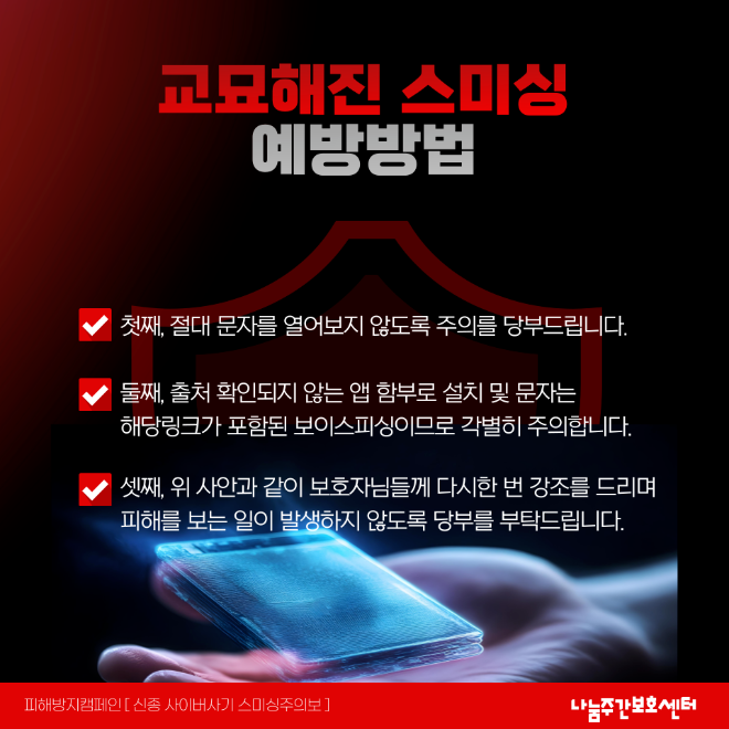 | 제목 | [스미싱 주의 안내] 보호자님께 드리는 안내 말씀 | 공지일 | 2026.04.11 |